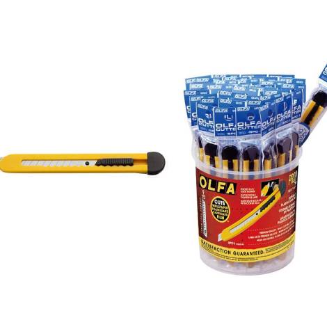 Economy with replaceable blade capability. 40 pcs. in a plastic bucket. A pocket clip/blade snapper is included.
