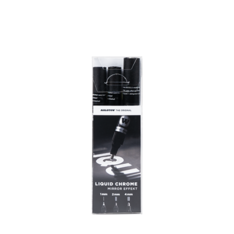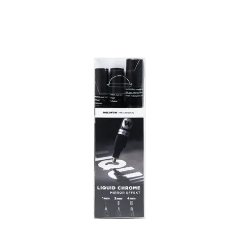 All good things come in threes. That‘s why our bestseller LIQUID CHROME is now available in a practical set of 3. LIQUID CHROME is known for its outstanding mirror effect, which is particularly visible on non-absorbent surfaces. Thanks to exchangeable tips and a practical refill in 30 ml, the pens can be used again and again.