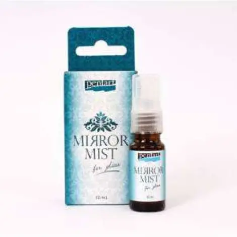 Solvent based paint for mirror eff ect on glass. It is recommended to use on the back side of the glass. Shake the bottle well before applying, then change the cap to the spray pump. Screw it tightly. Spray the paint evenly from approx 15 cm / 6 inches distance to the clean, degreased surface and allow to dry. Apply one more layer, if necessary. For protection - after it is completely dried (about 3 hours) - spray a thin layer of Pentart Protecting mist and when it becomes dried, apply a black matte acrylic paint using sponge brush.