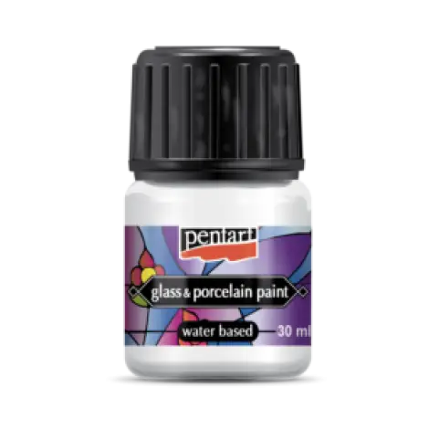 Glossy, transparent or opaque, water-based paint to decorate glass, porcelain and metallic surfaces. Colours can be mixed together, use Pentart glass&porcelain medium to lighten them. Be sure that the surface to be decorated is free of dust and grease. Glossy, water-based paint to decorate glass, porcelain and metallic surfaces. After drying (1 day) bake it in oven (100 oC , 30’) or in microwave oven (700W, 10’) and becomes water resistant.