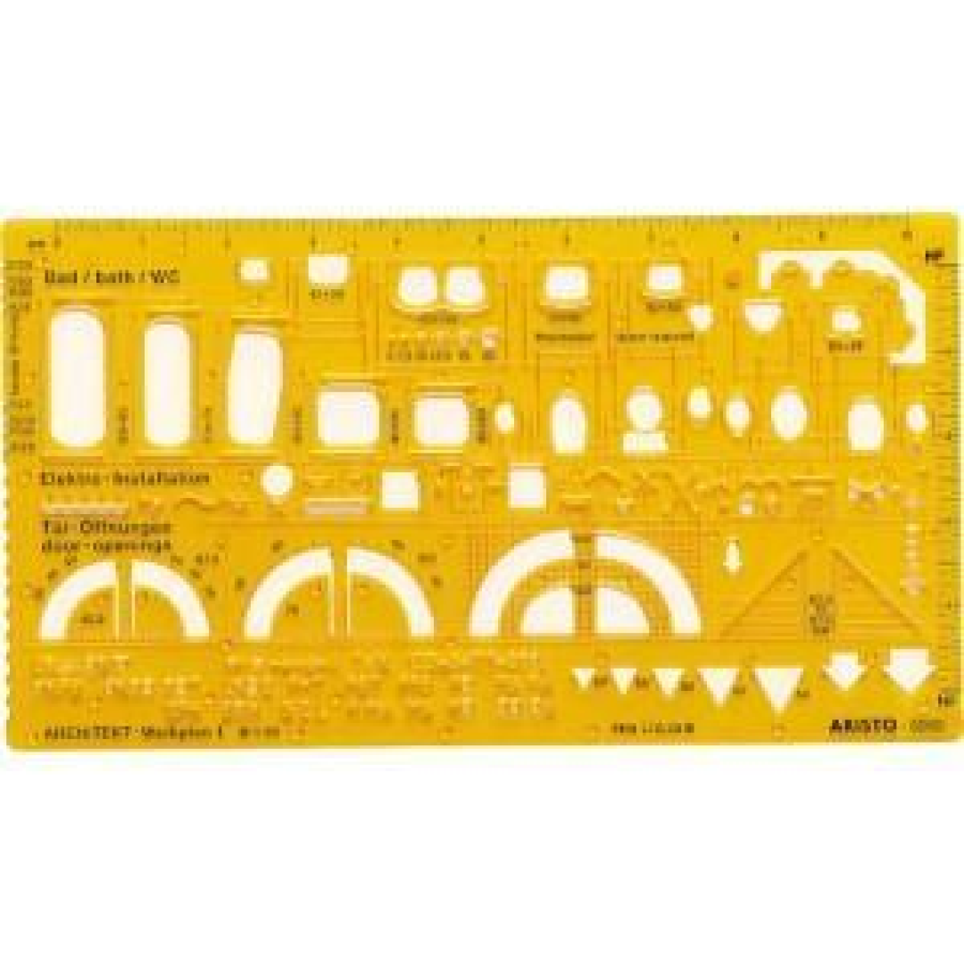 Scale 1:50, with symbols for sanitary fittings, electrical installations, door openings, widths of windows and short denotations. Level and direction symbols. With ink-bosses. Format 225 x 125 x 1,2 mm.