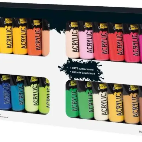 20 ml (White, Ivory, Citron, Genuine Yellow Light, Cadmium Yellow, Indian Yellow, Gen. Deep Orange, Terracotta, Portrait Rosé, Rosé, Genuine Red, Vermilion, Carmine Red, Magenta, Wine Red, Pale Blue, Primary Blue, Cerulean Blue, Violet, Cobalt Blue, Ultramarine Blue, Turquoise, Pale Green, Yellowish Green, Permanent Green, Foliage Green, Beige, Light Yellow Ocher, Gold Ocher, Dark Oxide Brown, Dark Brown, Black)