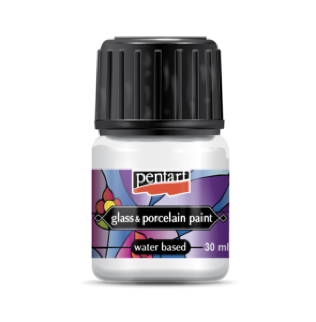 Fényes, átlátszó vagy fedő, vízbázisú festék üveg-, porcelán- és fémfelületek díszítéséhez. A színek egymással jól keverhetők, világosításukhoz Pentart üveg&porcelánfesték médiumot használjunk. Ügyeljünk arra, hogy a díszítendő felület zsír- és pormentes legyen. Fényes, vízbázisú festék üveg-, porcelán- és fémfelületek díszítéséhez. Száradás (1 nap) és kisütés (100 oC , 30 perc) vagy mikrozás (700W, 10 perc) után mosogatható.