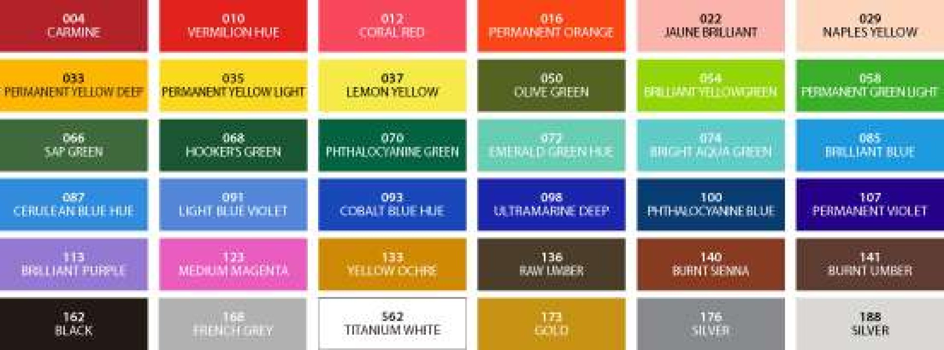004 Carmine, 010 Vermilion Hue, 012 Coral Red, 016 Permanent Orange, 022 Jaune Brilliant, 029 Naples Yellow, 033 Permanent Yellow Deep, 035 Permanent Yellow Light, 037 Lemon Yellow, 050 Olive Green, 054 Permanent Yellow Green, 058 Permanent Green Light, 066 Sap Green, 068 Hookers Green, 070 Phthalocyanine Green, 072 Emerald Green Hue, 074 Bright Aqua Green, 085 Brilliant Blue, 087 Cerulean Blue Hue, 091 Light Blue Violet, 093 Cobalt Blue Hue, 098 Ultramarine Deep,100 Phthalocyanine Blue, 107 Permanent Violet, 113 Brilliant Purple, 123 Medium Magenta, 133 Yellow Ochre, 136 Raw Umber, 140 Burnt Sienna, 141 Burnt Umber, 167 Black, 168 French Grey, 170 Titanium White, 173 Gold, 176 Silver, 188 Pearl White