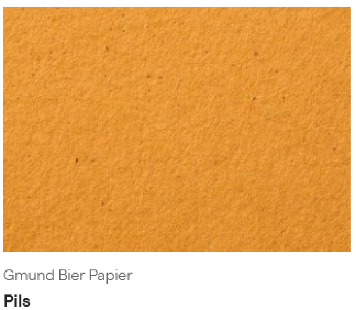 A Gmund Bier papír fő jellemzője a rusztikus, föld szerű textúra, és nem utolsósorban a sör készítéséhez használt visszamaradt alapanyagok (Komló és maláta) felhasználása.