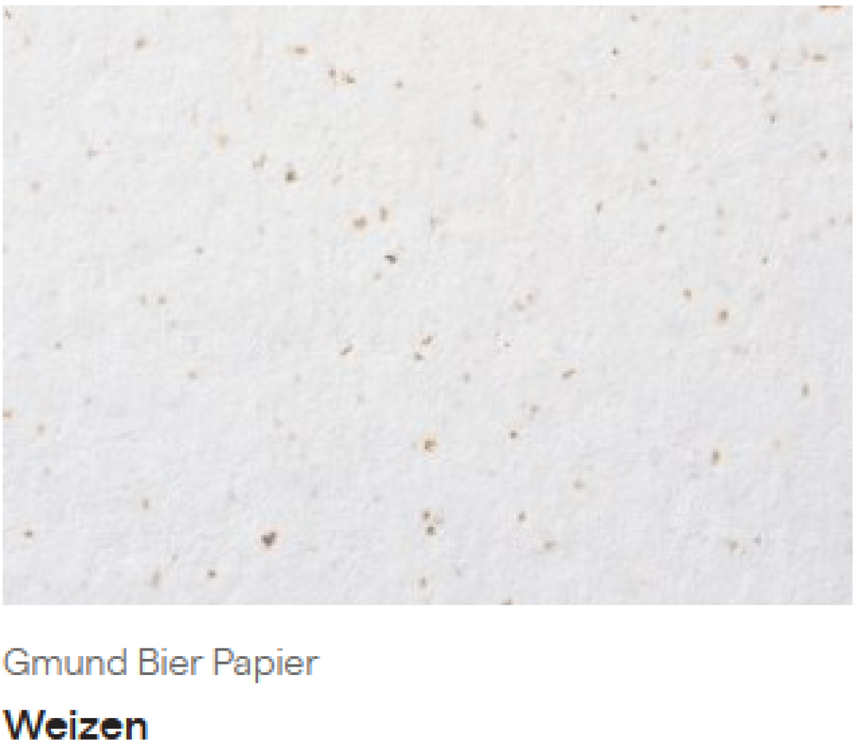A Gmund Bier papír fő jellemzője a rusztikus, föld szerű textúra, és nem utolsósorban a sör készítéséhez használt visszamaradt alapanyagok (Komló és maláta) felhasználása.