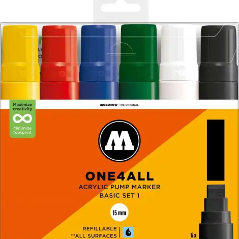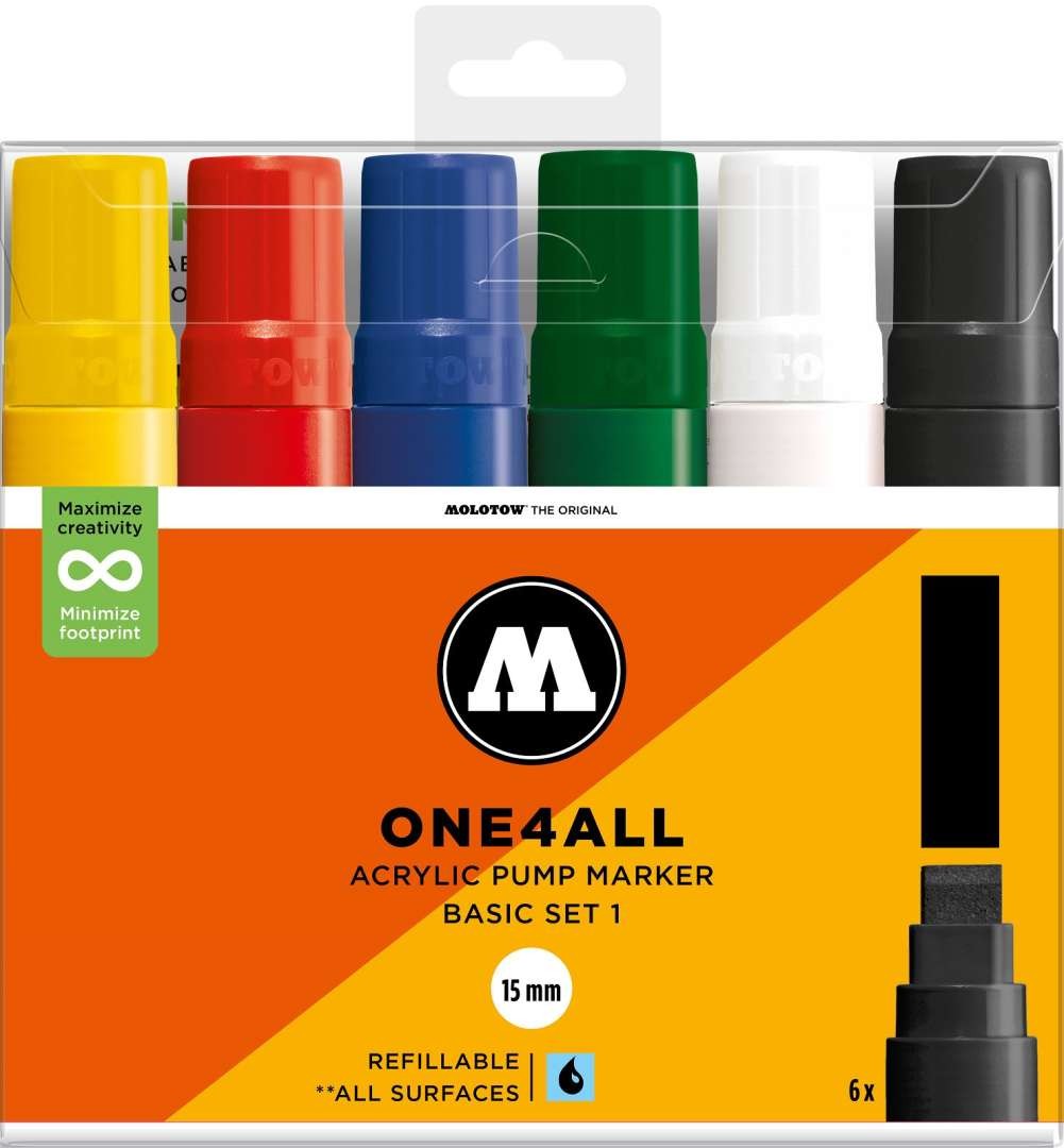 Ez a készlet 6 db ONE4ALL™ 627HS akril markert tartalmaz, vágott 15mm-es heggyel. Átlátszó, visszazárható tasakba csomagolva, termékinformációkkal.