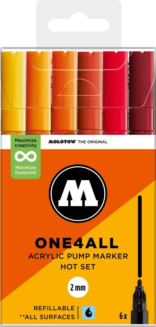 A Molotow ONE4ALL típusú 127HS akril pumpás marker szabványos cserélhető 2 mm-es heggyel rendelkezik, és 2024-től 74 színben kapható, s újratölthető. Nagy fedőképességgel rendelkezik, tartós és szinte minden felületen UV-álló. Akár szörfdeszkára, vászonra, hűtőre, graffitire vagy tornacipőre festesz: semmi sem lehetetlen. Nem hiányozhatnak egyetlen művész felszereléséből sem!