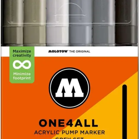 A Molotow ONE4ALL típusú 227HS akril pumpás marker szabványos cserélhető 4mm-es heggyel rendelkezik, és 2024-től 74 színben kapható, s újratölthető. Nagy fedőképességgel rendelkezik, tartós és szinte minden felületen UV-álló. Akár szörfdeszkára, vászonra, hűtőre, graffitire vagy tornacipőre festesz: semmi sem lehetetlen. Nem hiányozhatnak egyetlen művész felszereléséből sem!