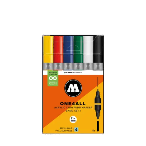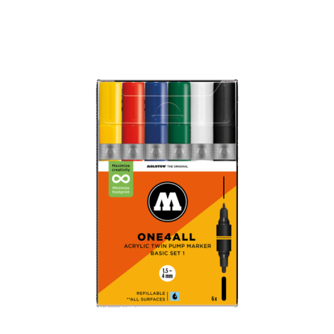 A Molotow ONE4ALL 2024-től 74 színben kapható, újratölthető. Nagy fedőképességgel rendelkezik, tartós és szinte minden felületen UV-álló. Akár szörfdeszkára, vászonra, hűtőre, graffitire vagy tornacipőre festesz: semmi sem lehetetlen. A hatékony színek (fluoreszkáló és fémes) sokkal vonzóbbá teszik a színezést. Nem hiányozhatnak egyetlen művész felszereléséből sem!