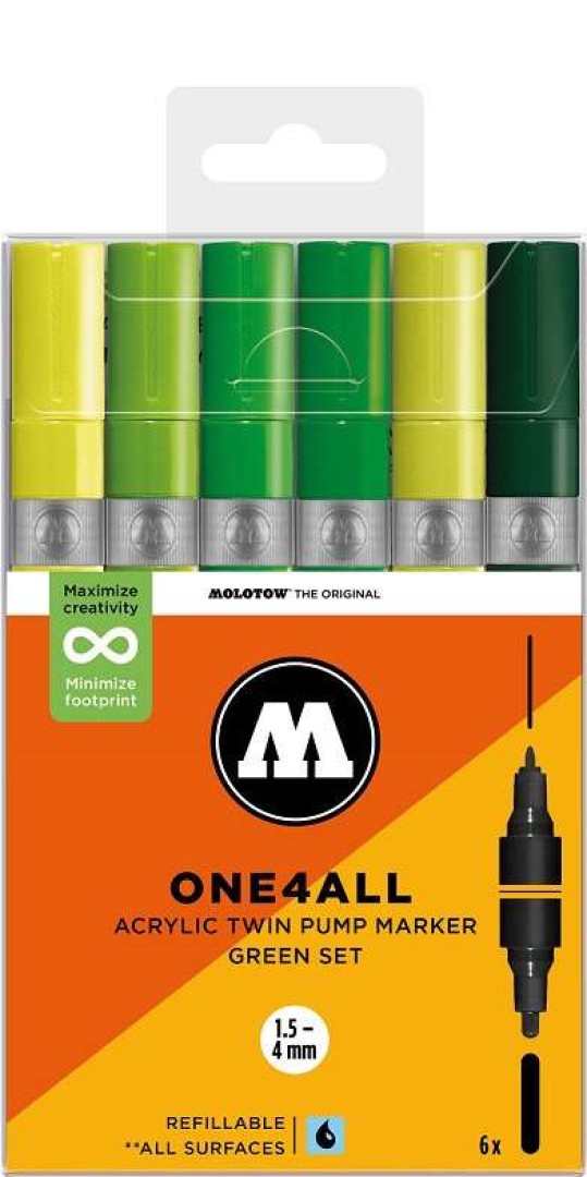 A Molotow ONE4ALL 2024-től 74 színben kapható, újratölthető. Nagy fedőképességgel rendelkezik, tartós és szinte minden felületen UV-álló. Akár szörfdeszkára, vászonra, hűtőre, graffitire vagy tornacipőre festesz: semmi sem lehetetlen. A hatékony színek (fluoreszkáló és fémes) sokkal vonzóbbá teszik a színezést. Nem hiányozhatnak egyetlen művész felszereléséből sem!