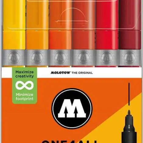 A Molotow ONE4ALL 2024-től 74 színben kapható, újratölthető. Nagy fedőképességgel rendelkezik, tartós és szinte minden felületen UV-álló. Akár szörfdeszkára, vászonra, hűtőre, graffitire vagy tornacipőre festesz: semmi sem lehetetlen. A hatékony színek (fluoreszkáló és fémes) sokkal vonzóbbá teszik a színezést. Nem hiányozhatnak egyetlen művész felszereléséből sem!