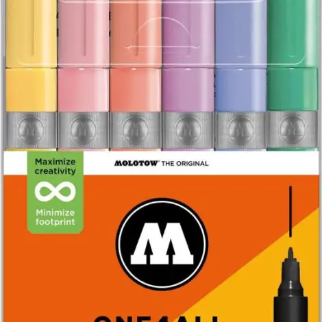 A Molotow ONE4ALL 2024-től 74 színben kapható, újratölthető. Nagy fedőképességgel rendelkezik, tartós és szinte minden felületen UV-álló. Akár szörfdeszkára, vászonra, hűtőre, graffitire vagy tornacipőre festesz: semmi sem lehetetlen. A hatékony színek (fluoreszkáló és fémes) sokkal vonzóbbá teszik a színezést. Nem hiányozhatnak egyetlen művész felszereléséből sem!