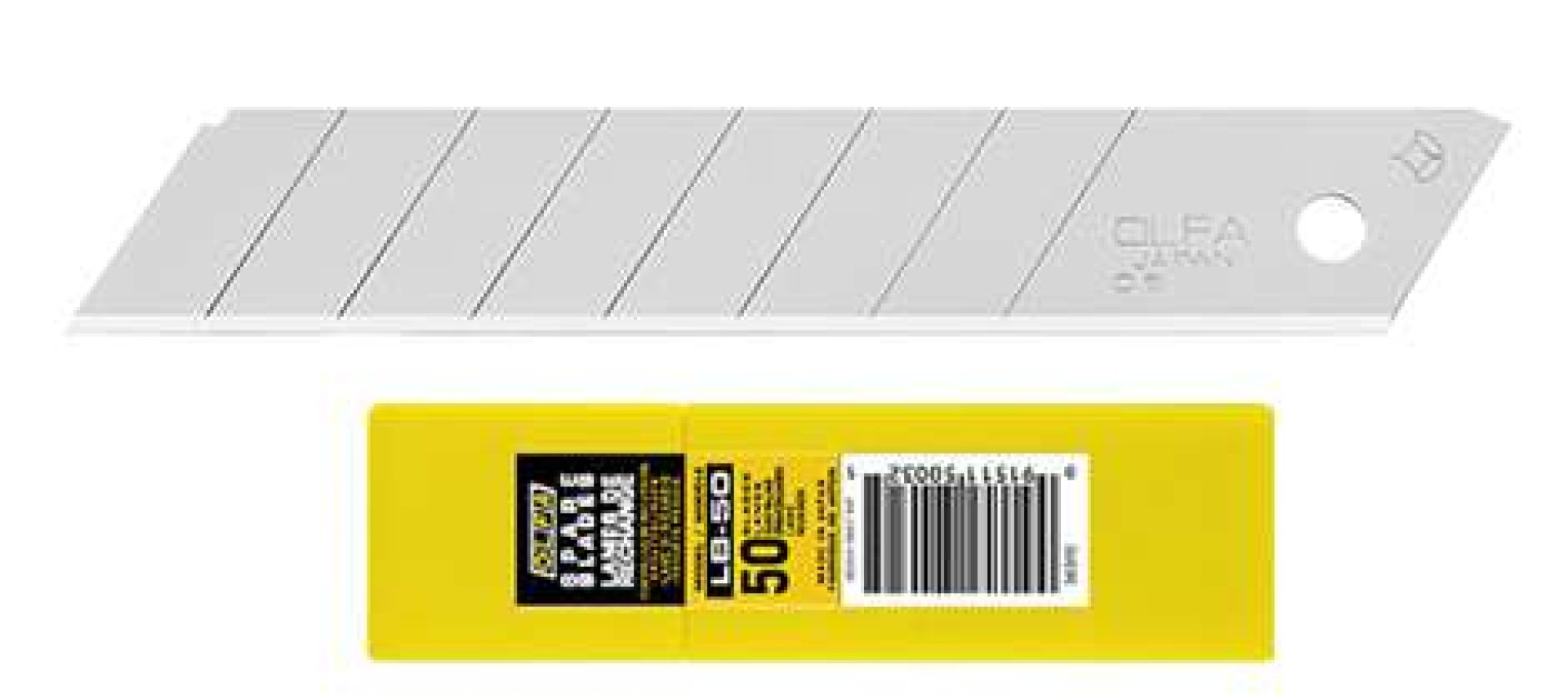 OLFA LB-50 - 18mm-es standard tördelhető penge. A következő standard késekhez alkalmazható: SL-1, BN-L, BN-AL, ML, L-1/green, L-2, XL-2, L-5, L5-AL, OL, NOL-1, NL-AL, PL-1, CL és CMP-2.