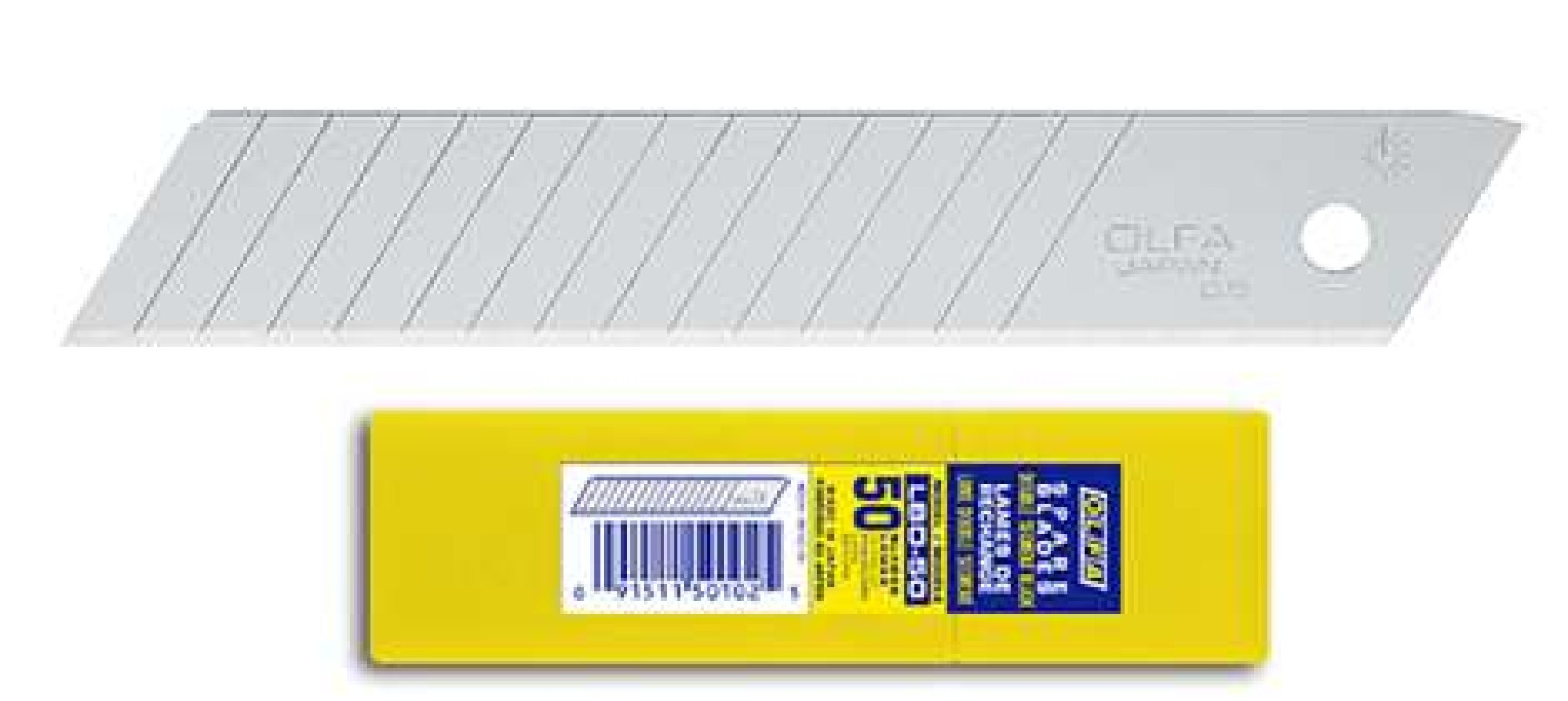 OLFA LBD-50 - 18mm-es sűrűbb szegmensű tördelhető penge. A következő standard késekhez alkalmazható: SL-1, BN-L, BN-AL, ML, L-1/green, L-2, XL-2, L-5, L5-AL, OL, NOL-1, NL-AL, és PL-1.