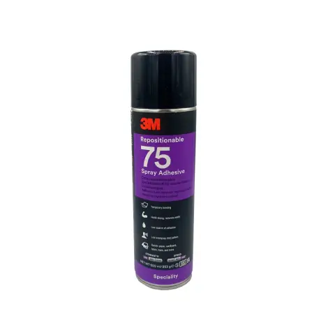 A 3M™ 75-ös, Áthelyezhető Ragasztóspray sokoldalú, nyomásérzékeny ragasztóspray, amely könnyű anyagok ideiglenes rögzítésére vagy felhelyezésére alkalmas, kiállítási céllal vagy a végleges összeszerelés előtt. Másodpercek alatt tapad, mégis extra hosszú tapadási tartománnyal rendelkezik, amely lehetővé teszi az anyagok emelését és áthelyezését.