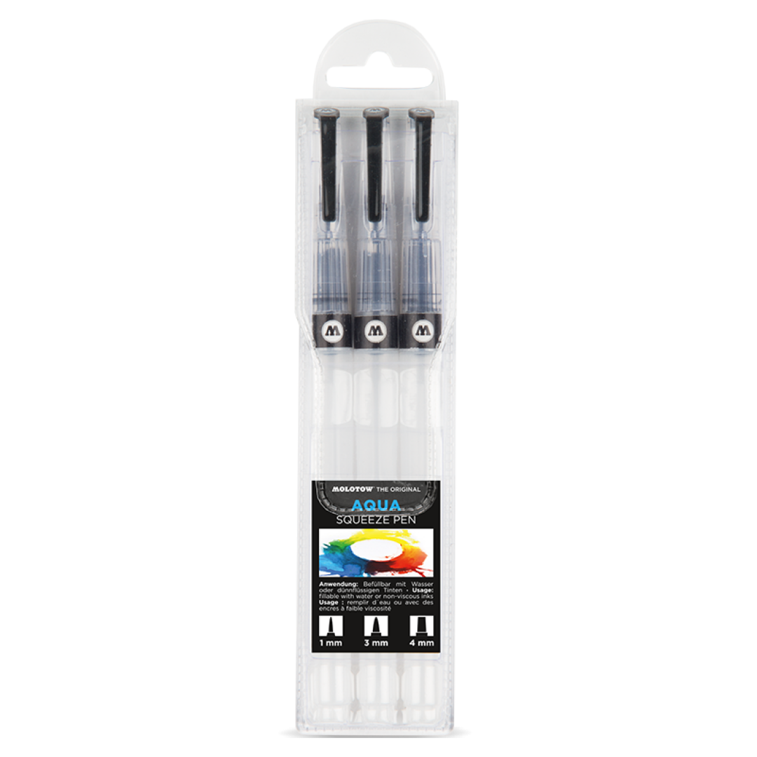 Az üres AQUA Squeeze Pen-nel a színezés nagyon egyszerű. Ez a rafinált eszköz szinte az összes híg tintával vagy vízzel könnyen újratölthető. A tollak ezenfelül gyerekek számára is alkalmasak. A Squeeze-Body összenyomásával a festék áramlása szabályozható és a hegyek valódi ecset módjára viselkednek.