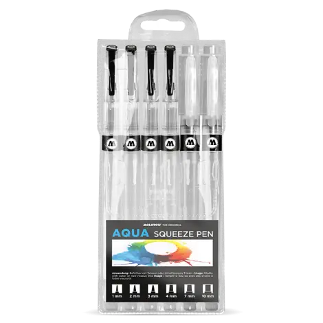 Az üres AQUA Squeeze Pen-nel a színezés nagyon egyszerű. Ez a rafinált eszköz szinte az összes híg tintával vagy vízzel könnyen újratölthető. A tollak ezenfelül gyerekek számára is alkalmasak. A Squeeze-Body összenyomásával a festék áramlása szabályozható és a hegyek valódi ecset módjára viselkednek.