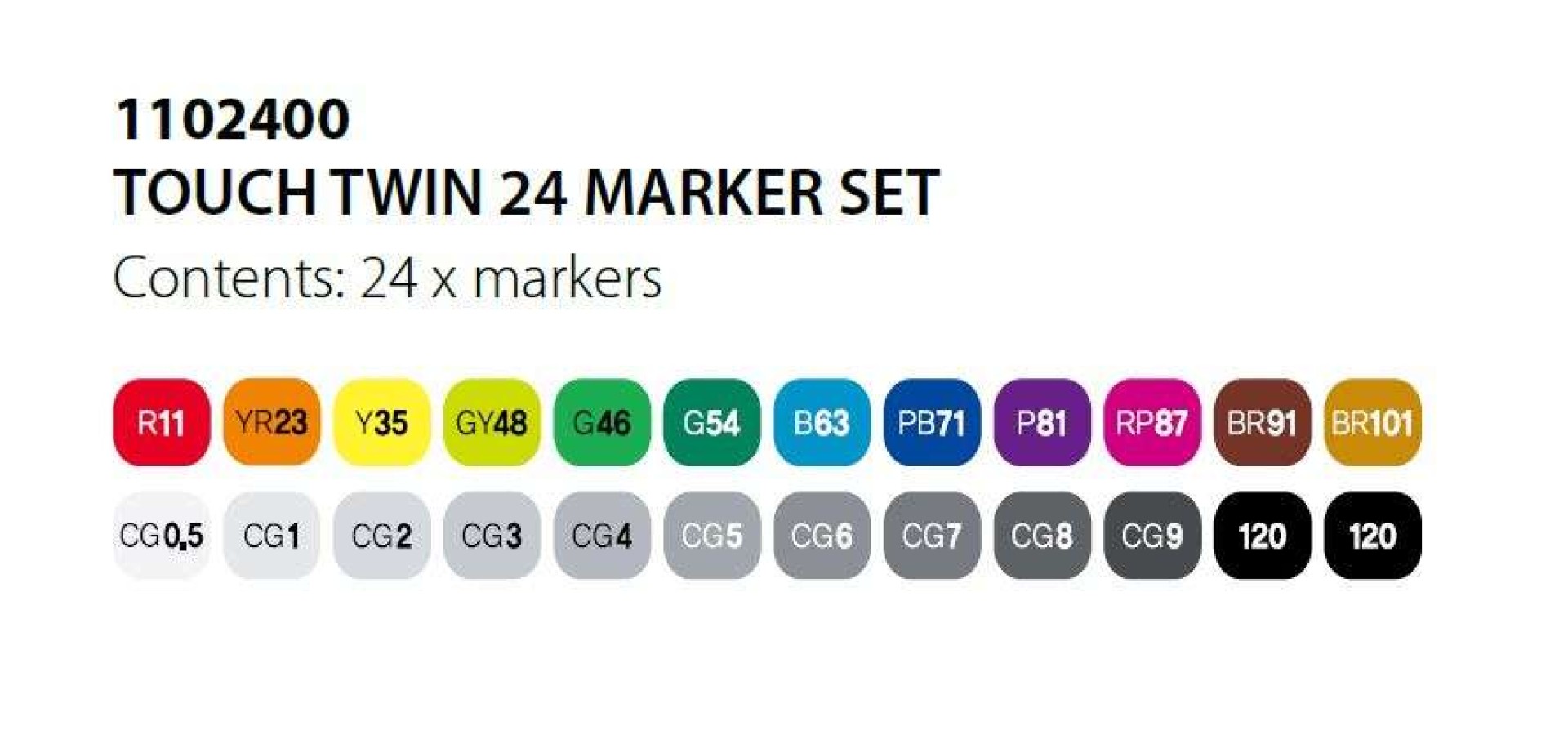 A TOUCH™ TWIN Marker 204 színben kapható, kiváló minőségű alkohol alapú tintákkal. Ezek a tinták nem oldják fel a tonertintát a nyomtatott papíron, ami lehetővé teszi a felhasználó számára, hogy átlépje a vonalakat anélkül, hogy a tinta megfolyna, és rétegezési technikák alkalmazásakor nem szennyezik az alatta lévő színeket. A színek az egészen halványtól az élénkig terjednek, több színprizmában.
